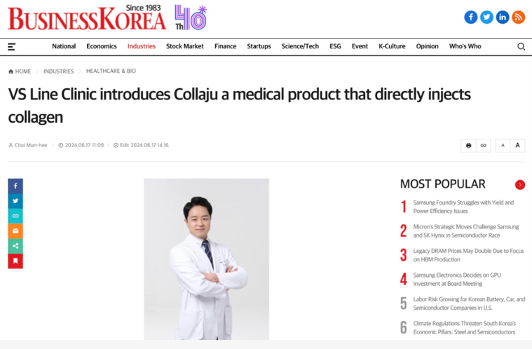 ​BusinessKorea published an article about VSLINE Clinic's announcement on June 9th, for the introduction of Collajua, a product that directly injects collagen.