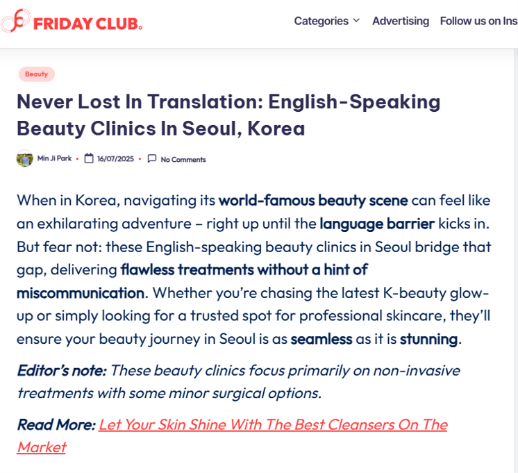 VS Line Clinic featured by Hongkong magazine Friday club as English - speaking clinic in Seoul, South Korea
